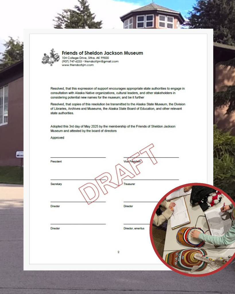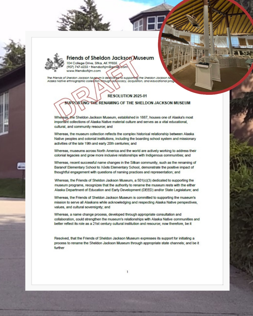 Members will vote the adopt or reject the full two-page resolution that asks if, “the Friends of Sheldon Jackson Museum express its support for initiating a process to rename the Sheldon Jackson Museum through appropriate state channels;” and if the Friends of SJM, “encourages appropriate state authorities to engage in consultation with Alaska Native organizations, cultural leaders, and other stakeholders in considering potential new names for the museum.”