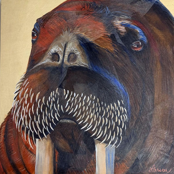 Titled Amgaadax̂, which means walrus in the Atkan / Unangam Tunuu language, this painting is acrylic on wood panel.