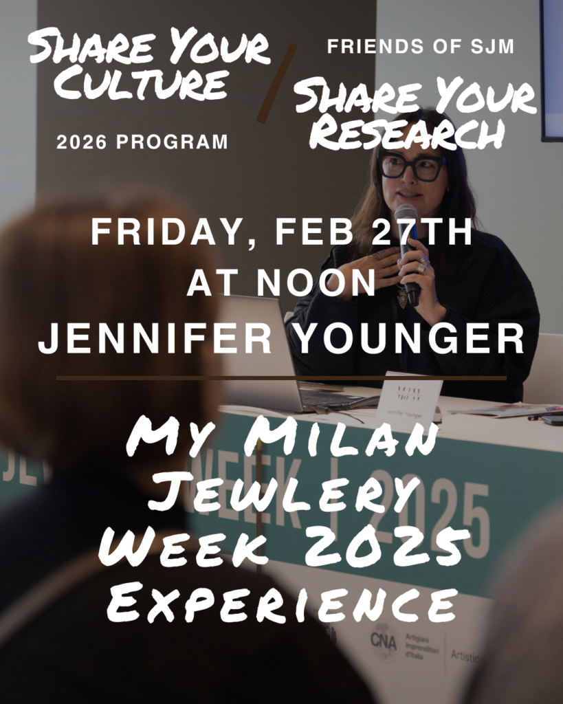 Jennifer Younger (Tlingit Eagle/Kaagwaantaan) will give a talk entitled, “My Milan Jewelry Week 2025 Experience” on Friday, February 27th at noon both in-person at the SJ Museum and simultaneously online. Jennifer Younger will share her experience from Milan Jewelry Week in October 2025. Hear how she presented at this major jewelry show and what she learned, did, and whom she met while there. She will give the behind-the-scenes process, from preparing her work to navigating one of the world’s most influential jewelry events. Jennifer will also reflect on how this opportunity is shaping her creative path and opening new doors for future collaborations. The Friends of Sheldon Jackson Museum helped sponsor Jennifer’s trip.