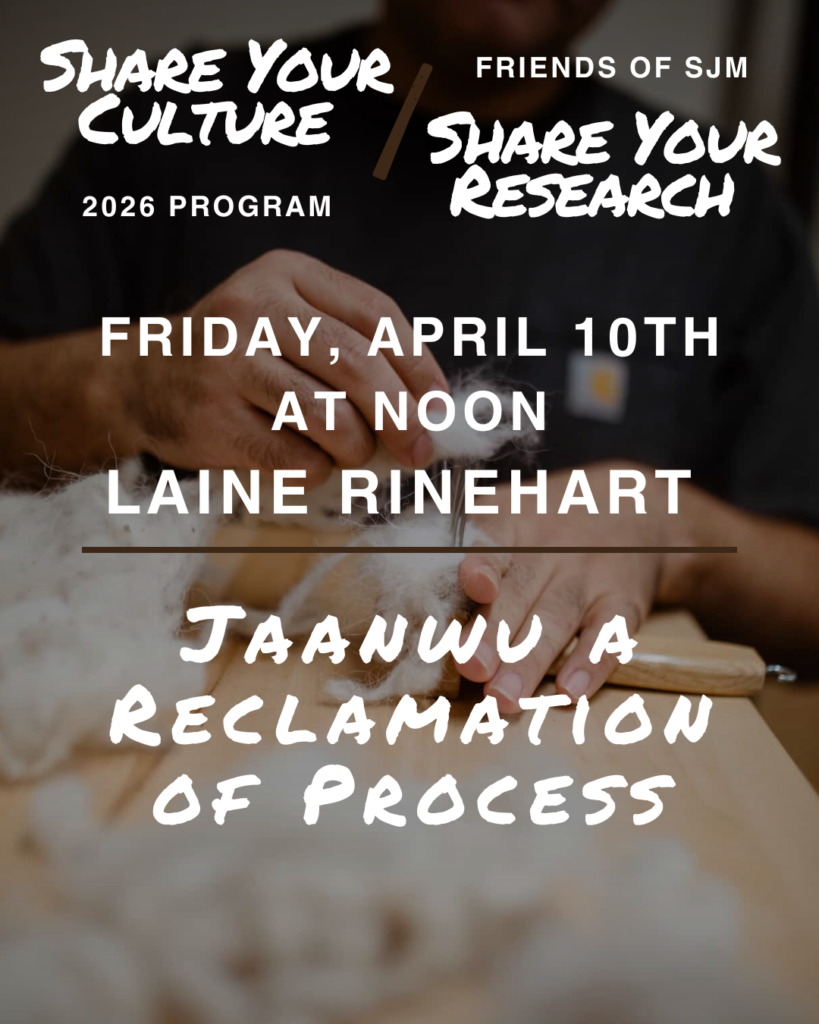 This is the fourth talk and sixth event in the 2026 Share Your Culture Share / Your Research presentation series. The series runs through the spring and focuses on subjects connected to Alaska Native cultures. Special thanks to our program sponsor Sea Level Consulting and private donors.