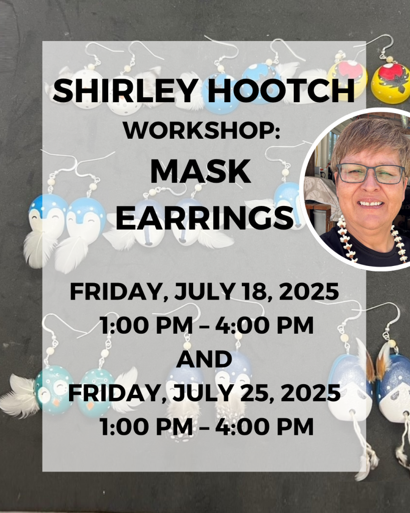 This is the second part of a 2-part workshop to make mask earrings with Yup’ik artist Shirley Hootch.  The workshop is 8 hours total. Participants are expected to attend both days: 4 hours on the afternoon of Friday, July 18, and 4 hours on the afternoon of Friday, July 25, 2025. This class is in-person only at Sheldon Jackson Museum. There is no zoom option available.